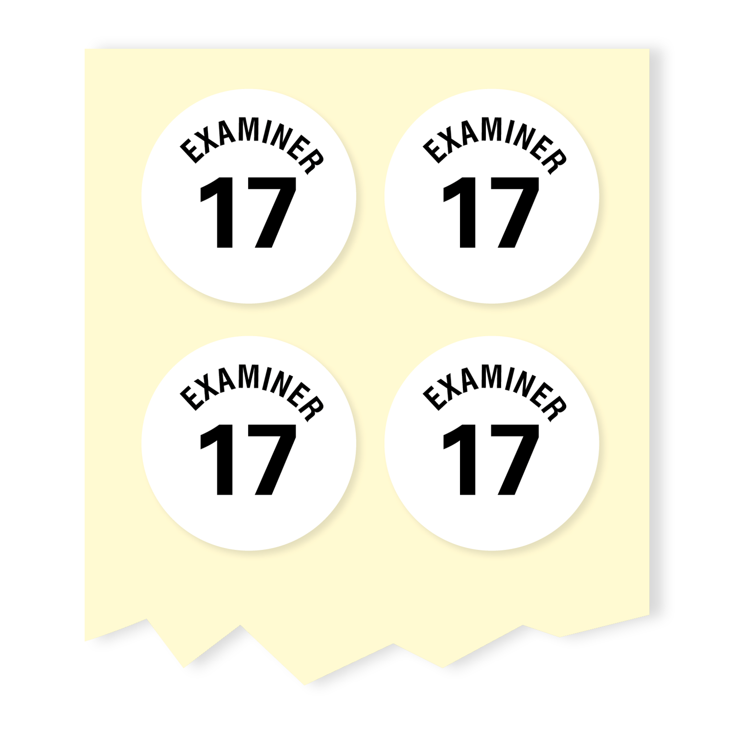 Roll of 5000, 12mm diameter white self-adhesive number labels printed with ‘Examiner’ and the number 17 in black.