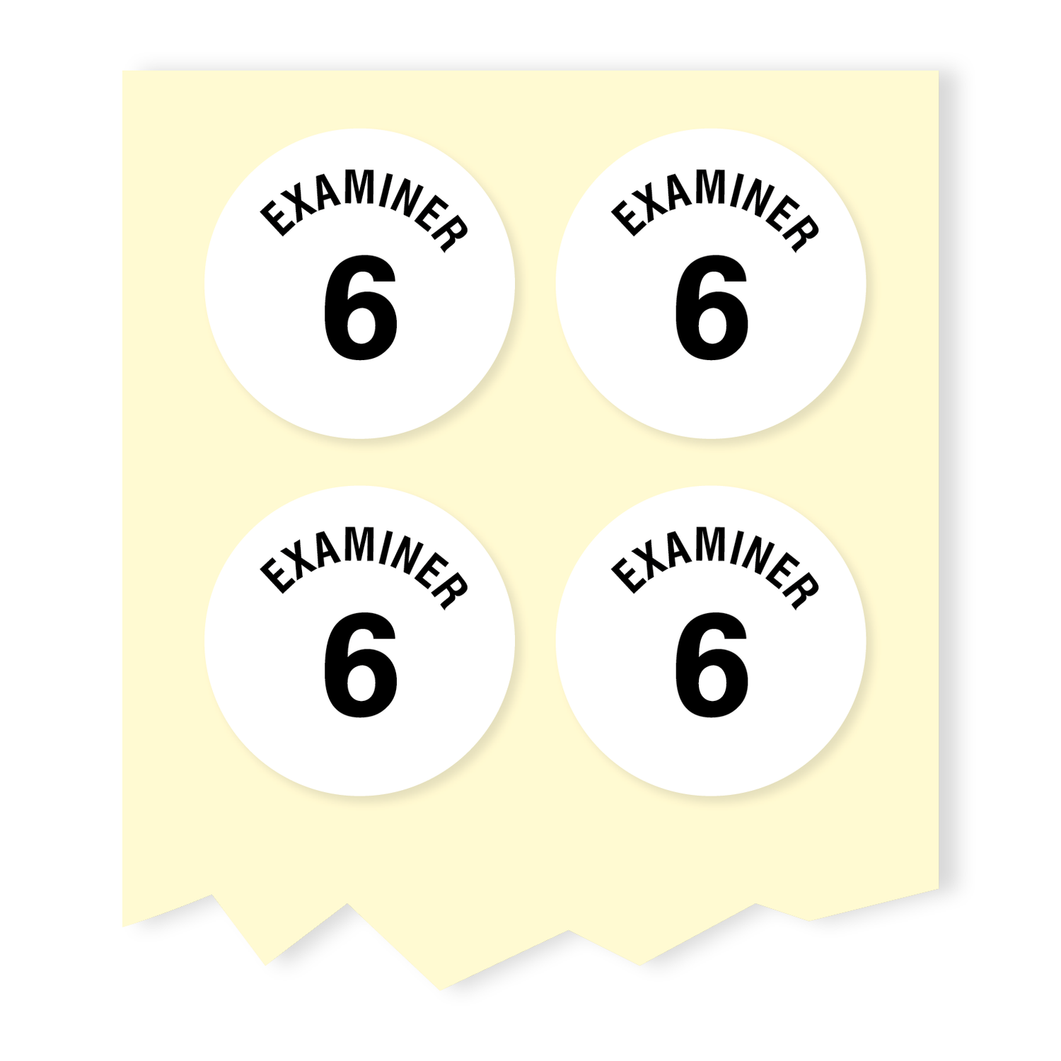 Roll of 5000, 12mm diameter white self-adhesive number labels printed with ‘Examiner’ and the number 6 in black.Used for checking quality on products, as well as highlighting examiners themselves.